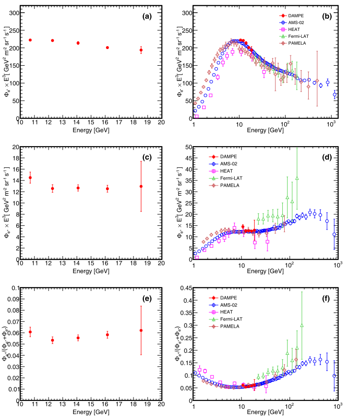 图表 2:DAMPE观测的10-20 GeV (a) 电子 (c) 正电子微分通量谱和 (e) 正电子比例, (b) (d) (f)DAMPE结果和 AMS-02、PAMELA、HEAT的比较