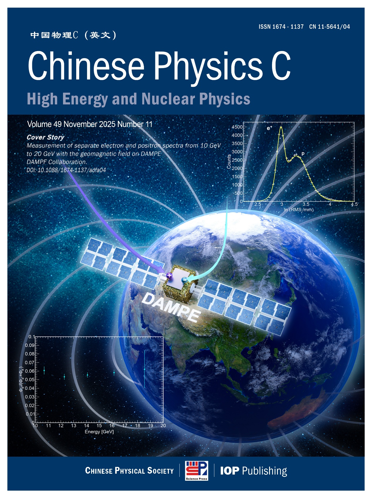 暗物质粒子探测卫星“悟空”号(DAMPE)国际科学团队在宇宙线电子与正电子观测研究方面取得重要成果。研究团队基于“悟空”号近九年的在轨观测数据,实现了在无磁体条件下10–20 GeV能区宇宙线电子与正电子微分通量谱以及正电子比例的测量。相关论文《Measurement of separate electron and positron spectra from 10 to 20 GeV with the geomagnetic field on DAMPE》发表在《Chinese Physics C》(Chinese. Phys. C 49, 115001 (2025)),并被选为当期封面文章及“编辑推荐(Editor’s Suggestion)”。高能物理研究所张双南研究员点评DAMPE实验的结果有效增强了早期实验测量结果的可靠性与可信度 (reinforcing the reliability of these earlier measurements)。