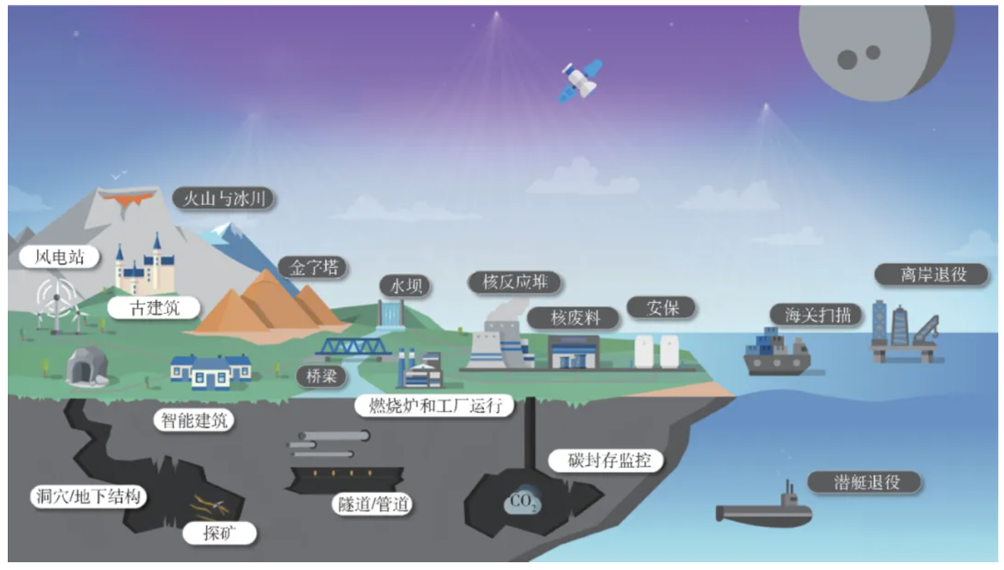 从20世纪50年代开始,宇宙射线缪子成像技术进入实际应用。E. P. George使用盖革计数器对澳大利亚Guthega Munyan隧道上方的岩石厚度进行了测量,这是宇宙射线缪子成像的首次应用[29]。此后,更多的成像应用实验得到开展。到目前为止,该技术已经在国土安全、自然灾害监测、自然文化遗产和地质与探矿等众多领域进行了广泛的应用(图6)。