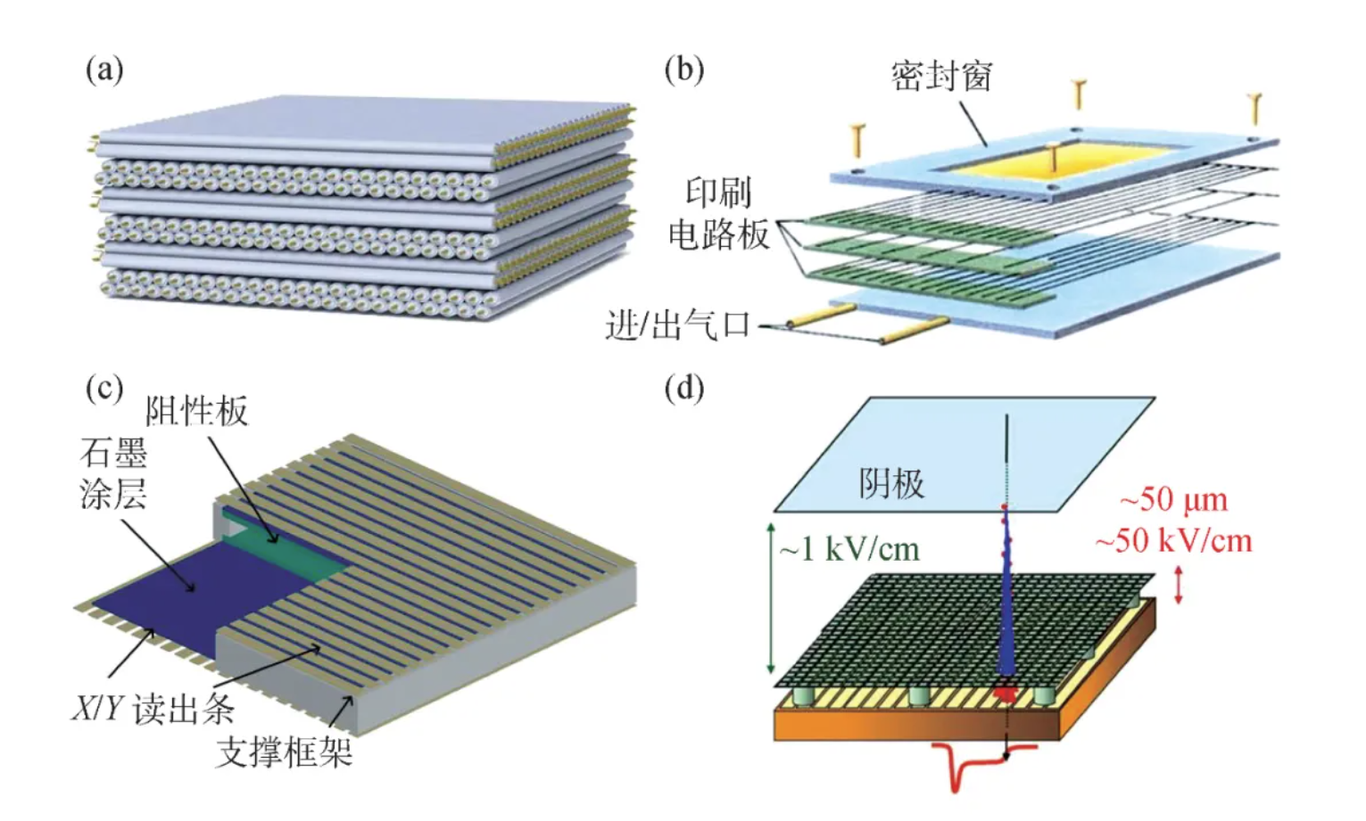 图5 不同类型的气体探测器示意图 (a)漂移管[23];(b)多丝正比室[24];(c)阻性板室[25];(d)微结构气体探测器[19—21]