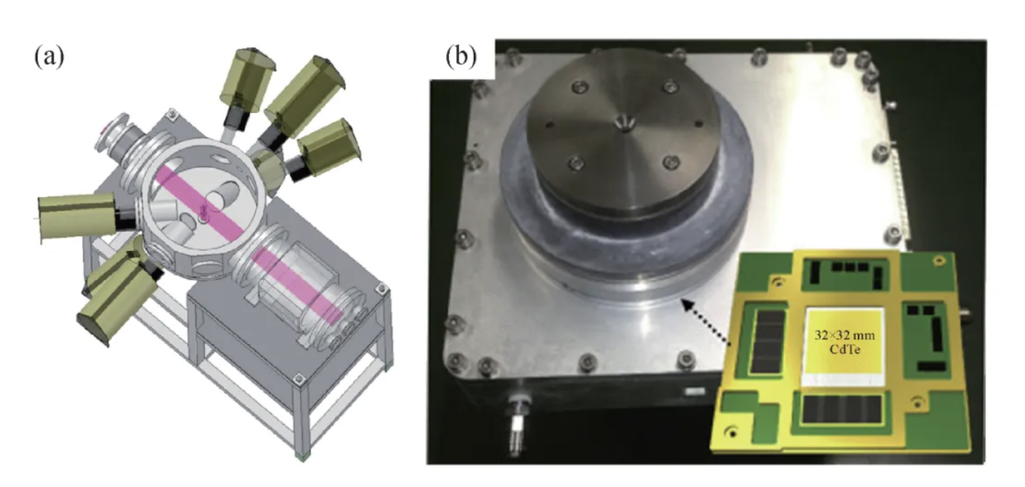 图13 J-PARC最新缪子原子X射线元素分析装置 (a)高纯锗探测器阵列(图中只显示6个探测器);(b)CdTe探测器