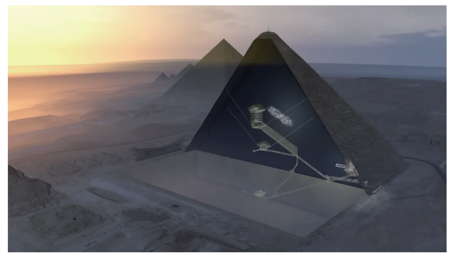 图10 胡夫金字塔及其隐藏内室(白点区域)三维图像(来源于www.newscientist.com)