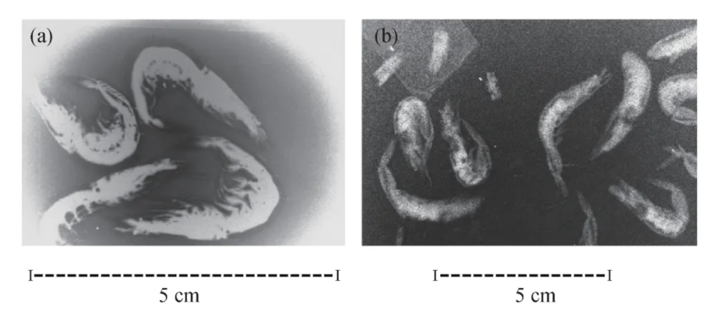 图11 使用缪子束(a)和正电子束(b)对虾进行透射成像得到的图像[41]