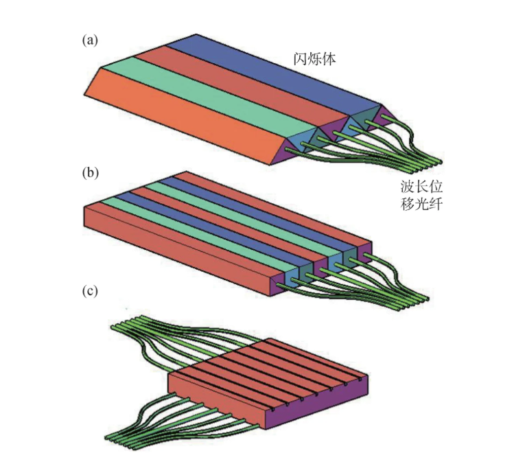 塑料闪烁体可塑性好、易加工、价格相对低廉、对环境变化不敏感以及对带电粒子探测效率接近100%,适用于宇宙射线缪子成像探测。粒子穿过闪烁体时损失能量使闪烁体原子发生激发—退激作用而产生荧光。荧光光子传输至光电倍增管(PMT)或硅光电倍增管(SiPM)被吸收并转换为光电子。光电子在PMT或SiPM内倍增产生电信号,从而实现对粒子的探测。在实际应用过程中,通常在闪烁体和PMT或SiPM之间耦合波长位移光纤,将荧光光子波长转换到其光阴极可接收的范围。图4示意了3种常用的塑料闪烁体探测器布局。此外,闪烁光纤[7]也可用于成像探测器的搭建。受限于塑料闪烁体条加工尺寸,探测器位置分辨可以做到毫米到厘米量级,对应角分辨为数个到数十个mrad。