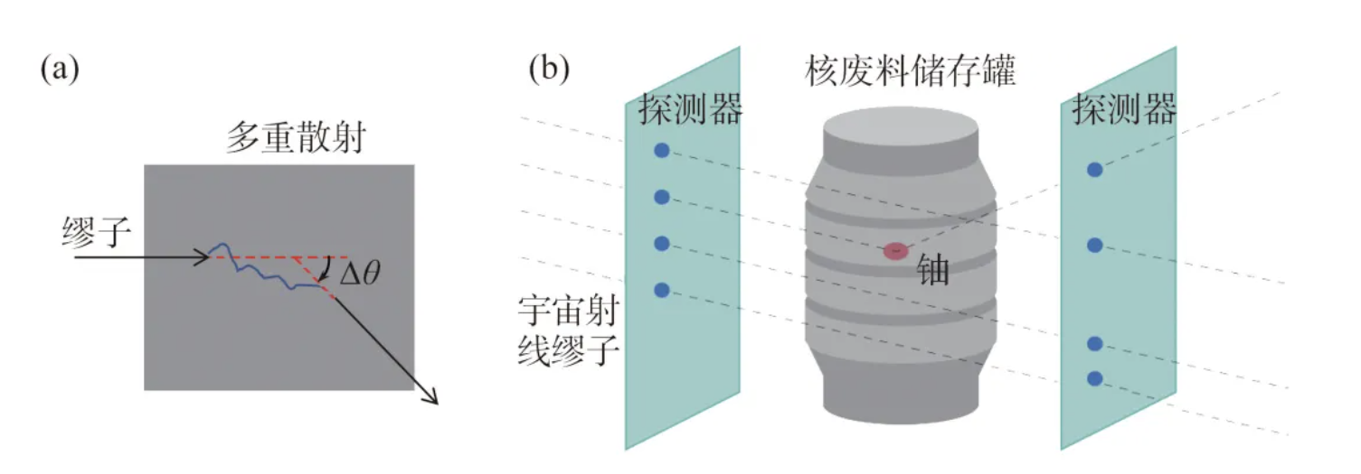 图3 (a) 缪子多重散射示意图;(b) 散射成像示意图(来源于nature.com)